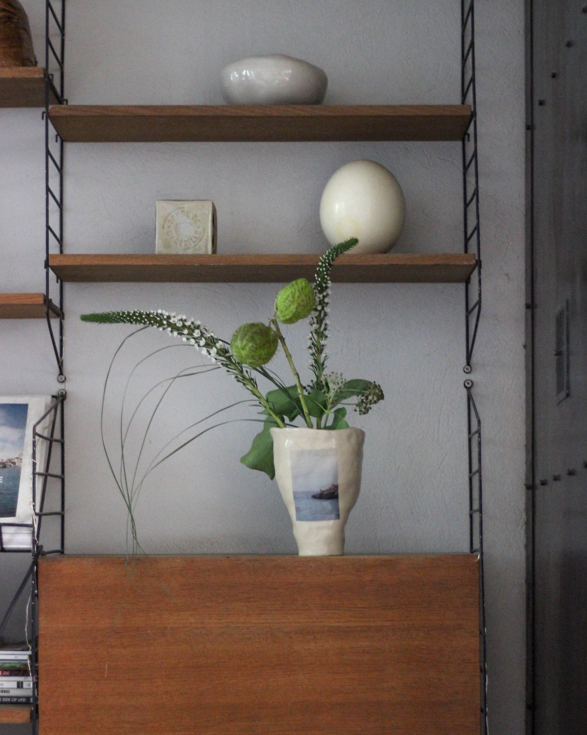 Vase en grès beige avec l’impression d’une de mes photos de la calanque de Samena, à Marseille.