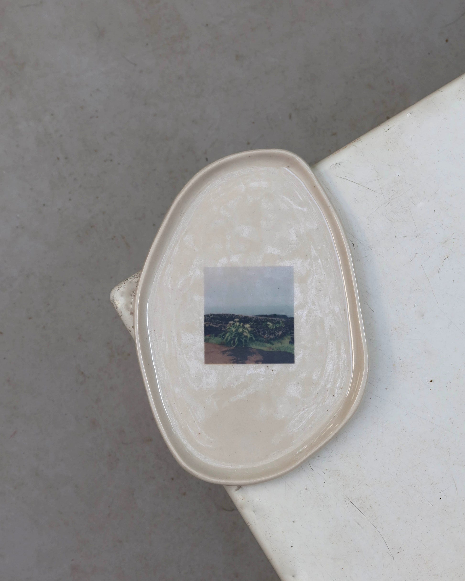 Petit plateau en grès aux bords irréguliers, chargé d’un instant capturé.