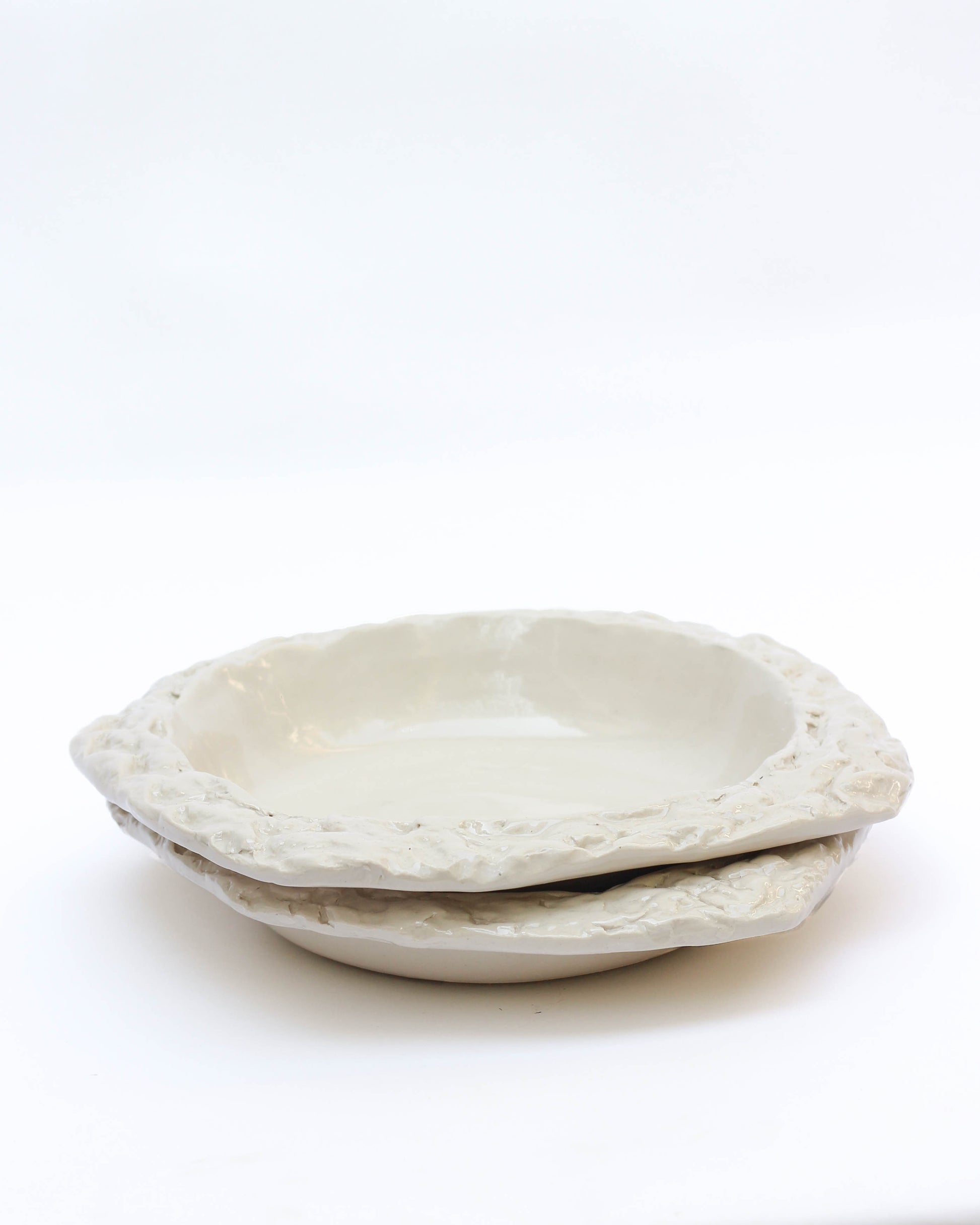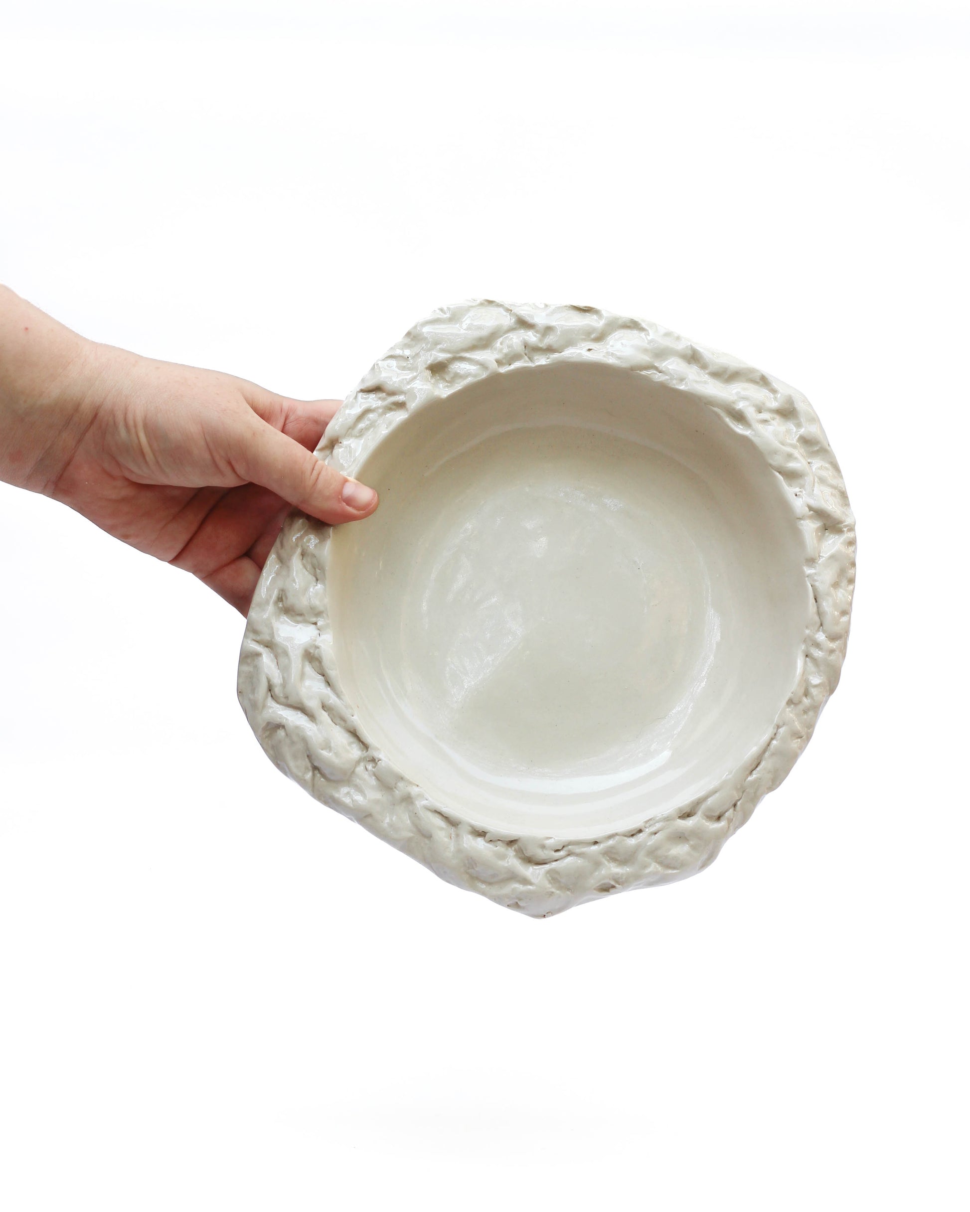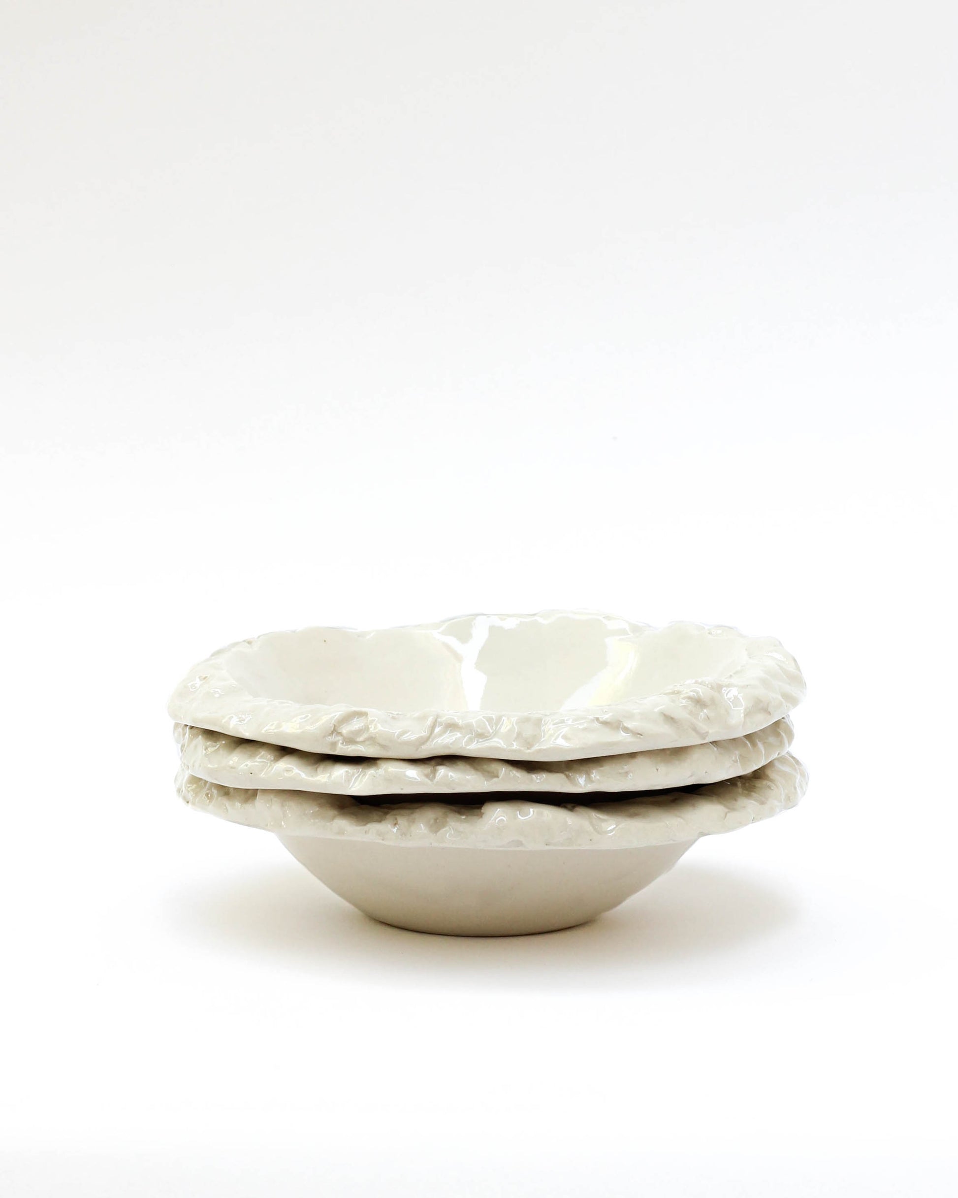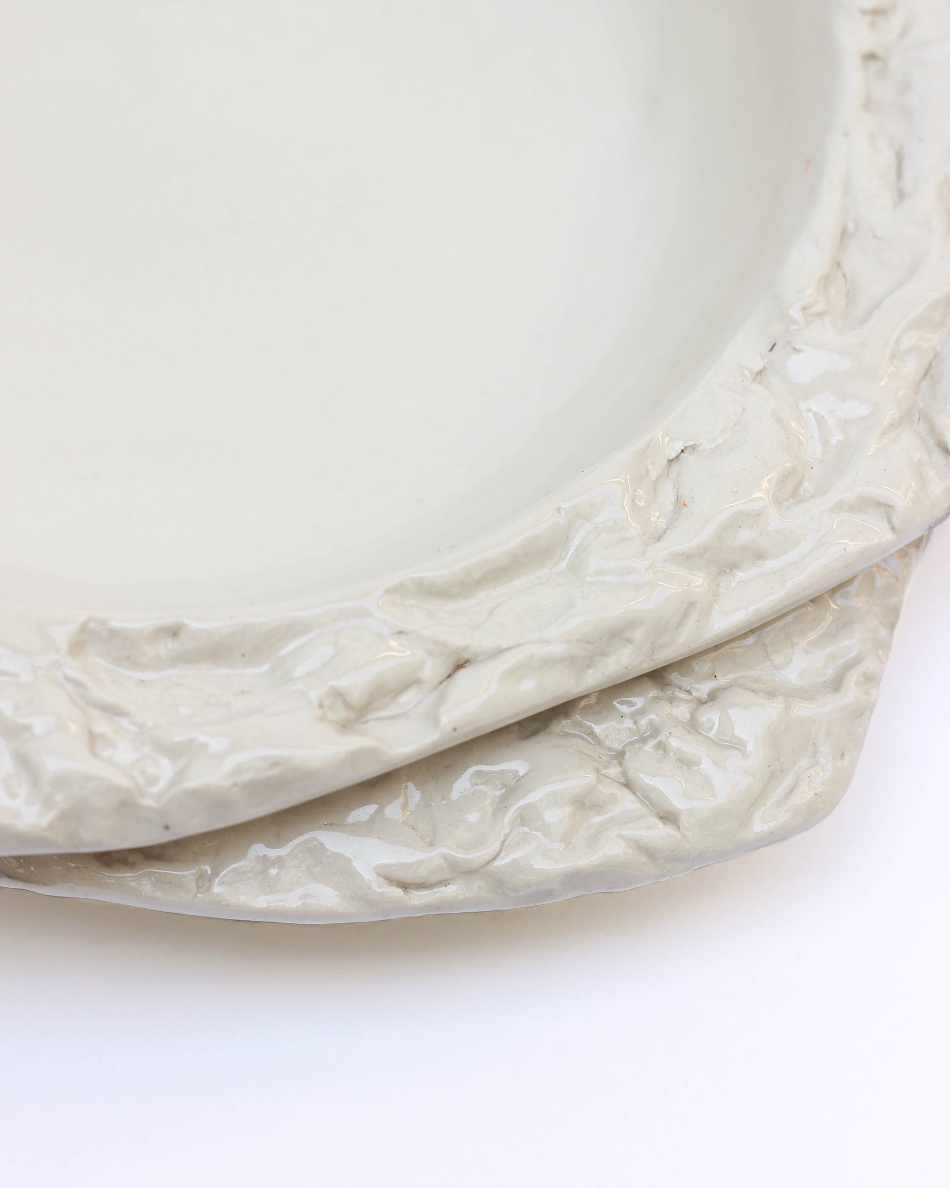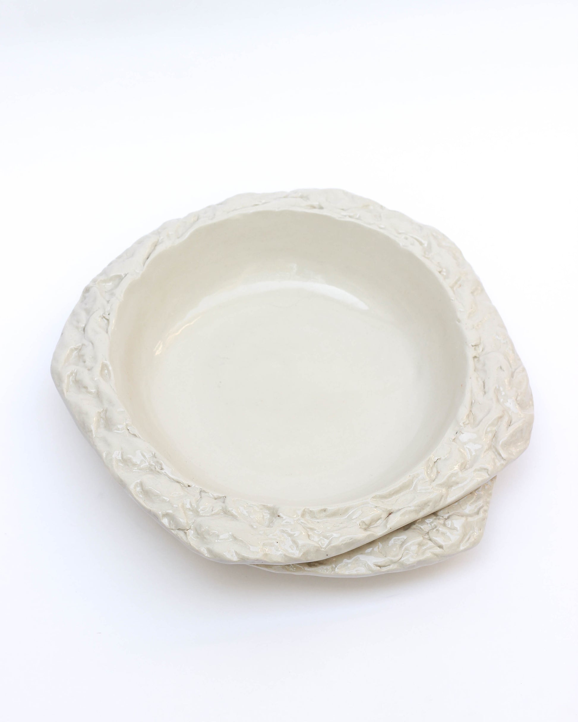 Assiette creuse en grés blanc. Les bords de cette assiette ont été texturé avec des cailloux que j'ai ramassé dans la calanque de Samena à Marseille. Chaque bord d'assiettes est différent et irrégulier. Entièrement fait à la main.